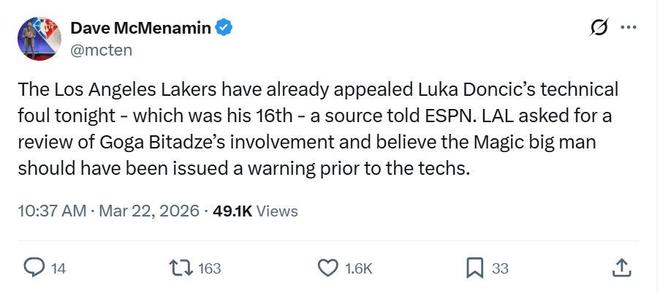 ESPN名記Dave McMenamin跟進曝出,湖人隊已經向聯盟提交上訴,要求對比塔澤行為進行復查的同時,認為裁判在吹罰T之前應當先警告。