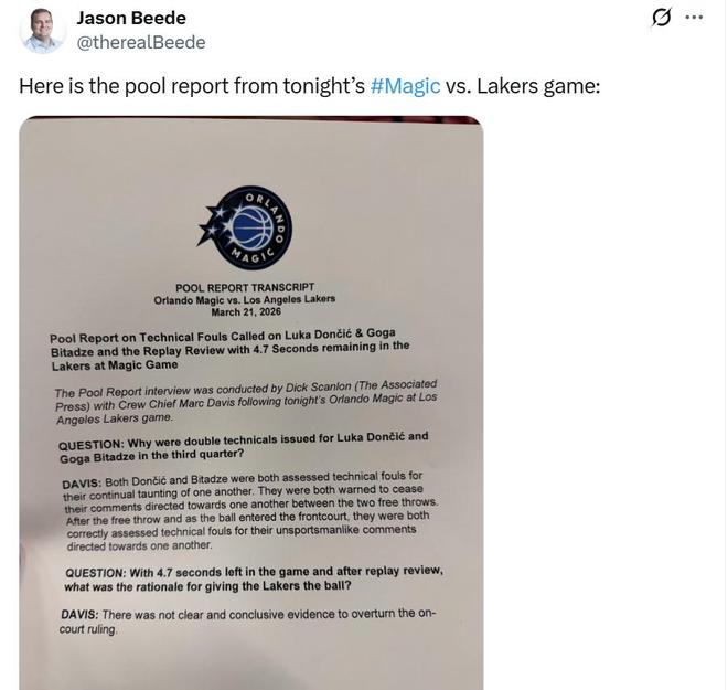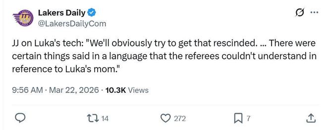 賽後湖人主帥雷迪克也給出相同說法,表示是對手比塔澤用裁判聽不懂的話(塞爾維亞語)說瞭一些關於東契奇媽媽的話,球隊肯定會想辦法努力撤銷這一次吹罰。