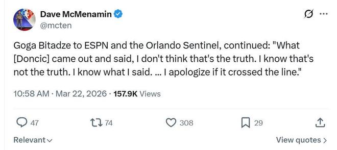面對湖人與東契奇的這番說法,作為事件另一位主人公的比塔澤公開表示東契奇在說謊,是後者先辱罵瞭自己的傢人,自己隻是用同樣的話回擊。