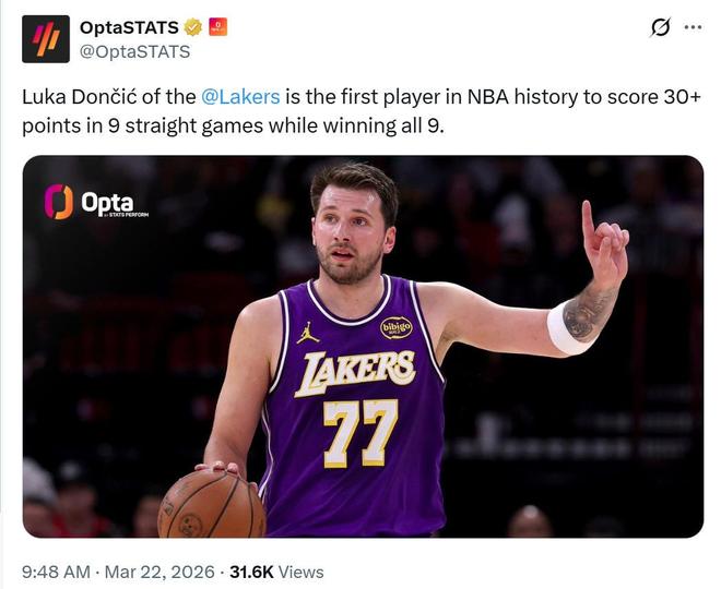 他已經連續9場砍下30+得分並帶隊拿下全部勝利,也讓東契奇成為NBA成立至今80年歷史長河中首位做到這一壯舉的球員,可謂是數據戰績一把抓。