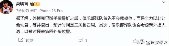 北京時間3月22日,根據媒體人“夏曉司”報道,外援克裡斯手指骨折之後,俱樂部球隊首先不會裁掉他,而是全力以赴讓他恢復,等待復出,預計時間是三周到四周。其次,俱樂部球隊也會考慮新外援人選,以暫時頂替第四外援位置。
