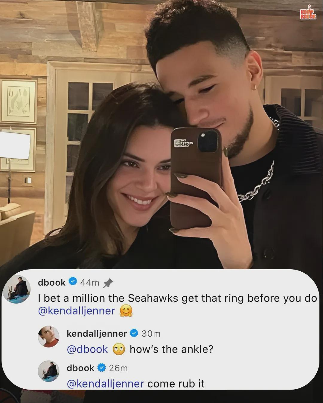 不仅如此,今年1月30日,布克跟詹娜曾在评论区暧昧互动。布克写道:“我压一百万,海鹰队(NFL)比你更早拿到戒指。”过了十几分钟,詹娜回复:“你的脚踝怎么样了?(白眼的表情)”布克表示:“你来给我揉揉它……”引来不少吃瓜群众。