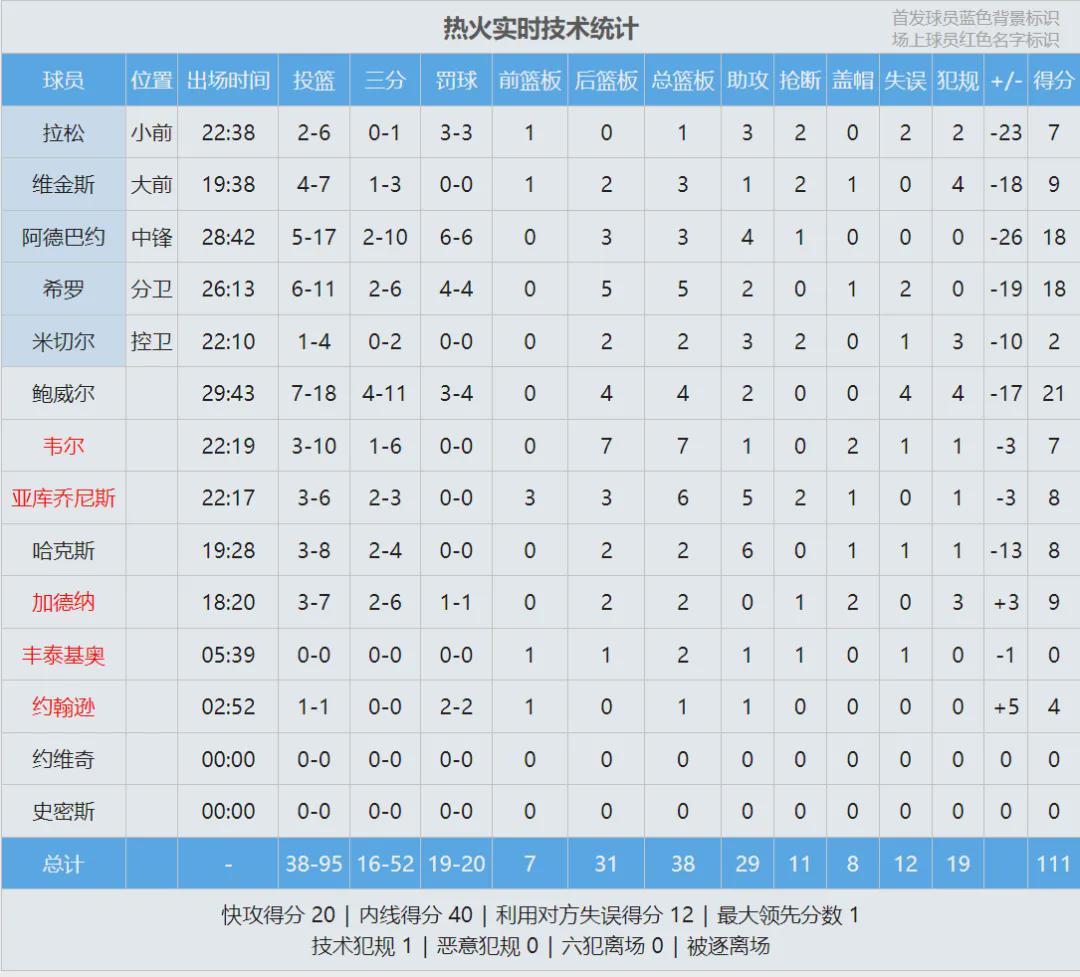热火中锋阿德巴约首发出战28分42秒,投篮17中5,三分10中2,罚球6中6,拿到18分3篮板4助攻1抢断,正负值-26全场最低。热火惨遭5连败,阿德巴约狂轰83分之后,热火1胜5负。更扎心的是,热巴跟斯波教练在场边发生冲突。