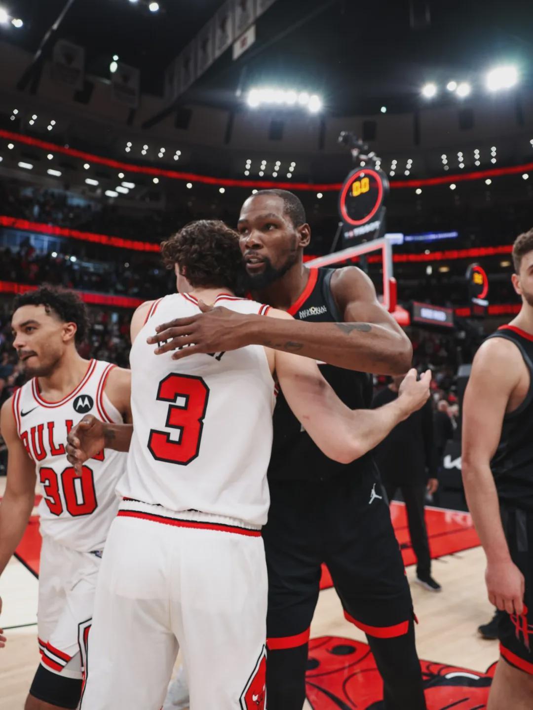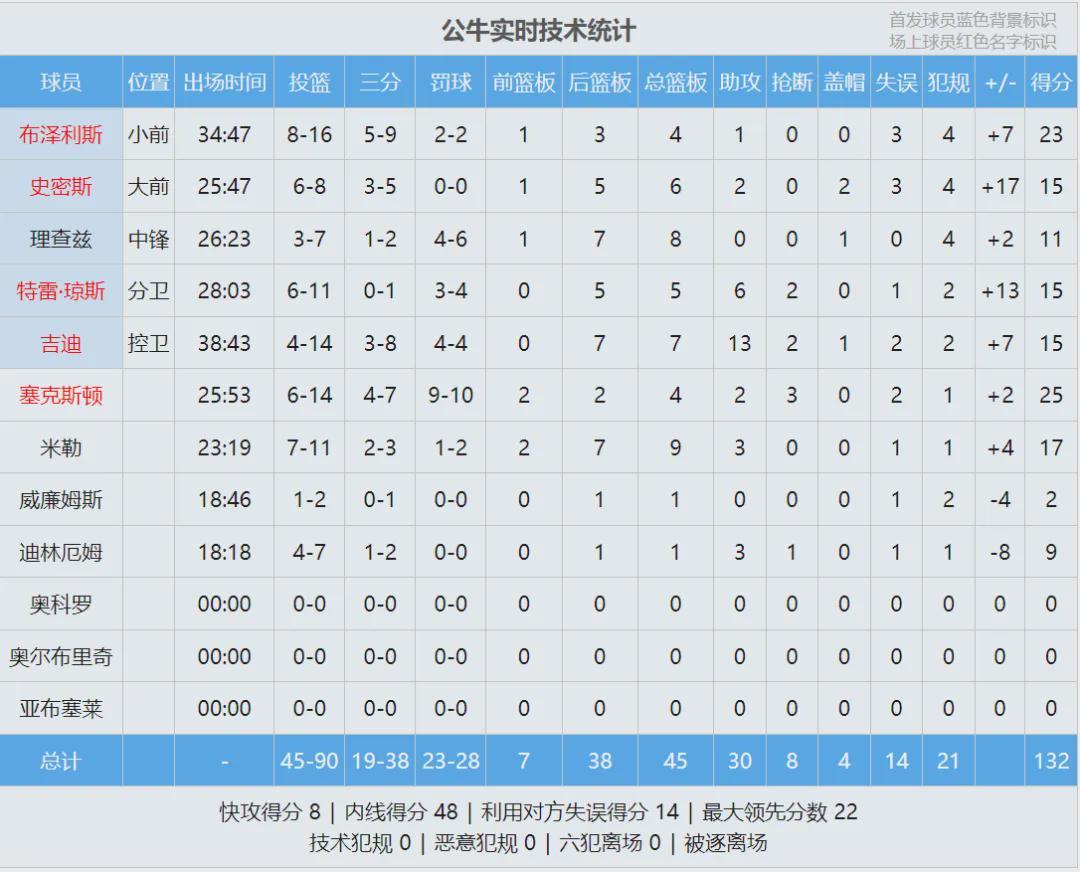 这是杜兰特生涯第74场40+,NBA现役第四多,前三名分别是:哈登107场、詹姆斯79场、库里75场。公牛这边7人得分上双:塞克斯顿25分4板3断、布泽利斯23分4板、吉迪15分7板13助2断。公牛全队三分38中19,命中率50%!