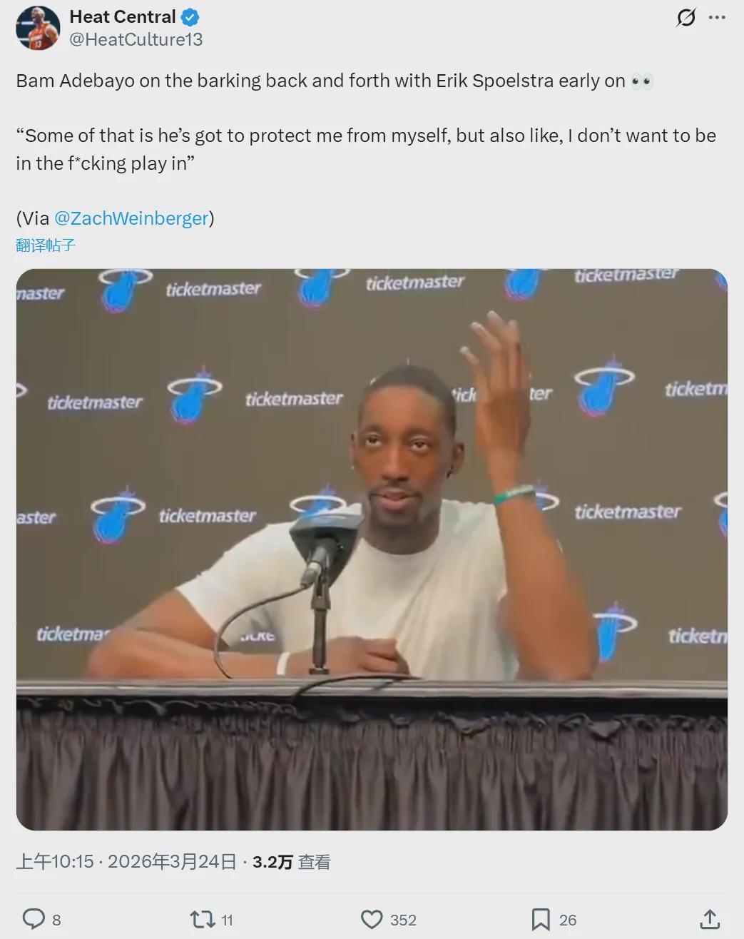 近日阿德巴约接受采访时,多次强调自己不想打附加赛。理想很丰满,现实很骨感。目前热火38胜34负排名东部第9,领先第10的黄蜂0.5个胜场,落后第8的魔术同样是0.5个胜场。热火落后第6的老鹰2个胜场,想要逃离附加赛很难。