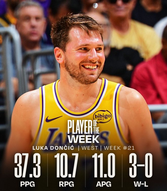 湖人後衛東契奇當選西部周最佳球員。這是他本賽季第3次獲此殊榮,職業生涯第18次當選。