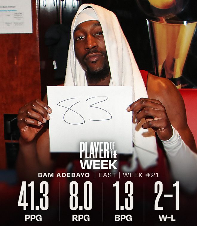 熱火內線阿德巴約當選東部周最佳球員。這是他本賽季第2次、職業生涯第4次獲此獎項。