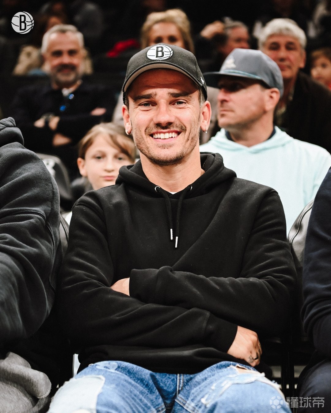 本场比赛,现马竞前锋、下赛季将征战美职联的格列兹曼来到篮网主场进行观赛,他身着黑色卫衣蓝色牛仔裤的休闲装扮,带着印有篮网队徽的鸭舌帽。