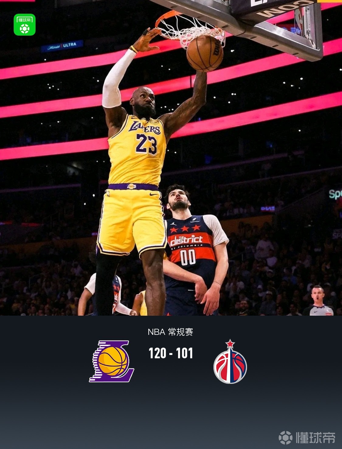 第四节,开节湖人詹姆斯、海斯联手迅速领先至20分以上,随后肯纳德、八村垒中远投继续得分领先至30分,比赛逐渐进入练兵时间,最终湖人120-101战胜奇才。