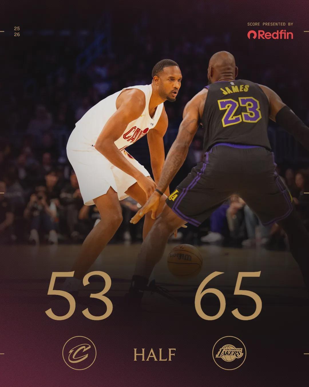 拉拉维亚半场4中4拿到9分,还在阿伦头上完成一记隔扣。第二节湖人33-19,单节净胜骑士14分。半场战罢,湖人65-53领先骑士12分。米切尔6中1,拿到2分3助攻。东契奇15中7,半场砍下20+4+7。湖人篮板22-14,前场板7-4!
