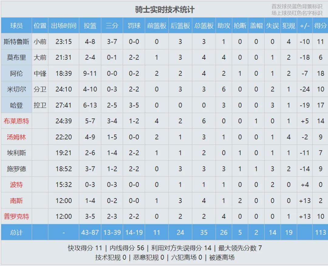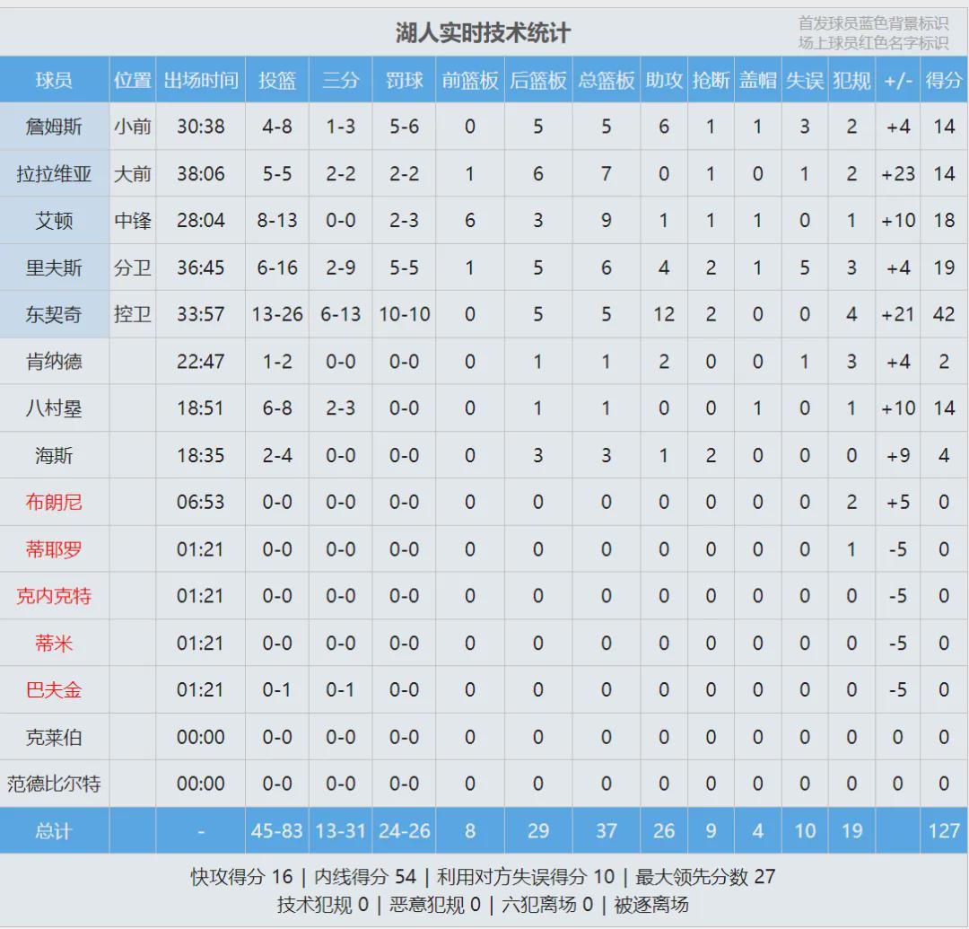 第四节骑士换上纯替补阵容,本来要放弃比赛了。湖人自己进攻断电,最后5分钟被骑士追到14分,湖人赶紧把东契奇换上场。东契奇连拿7分+1助攻,湖人再次拉开到20分。全场结束,湖人主场127-113战胜骑士,最近14场,湖人13胜1负。