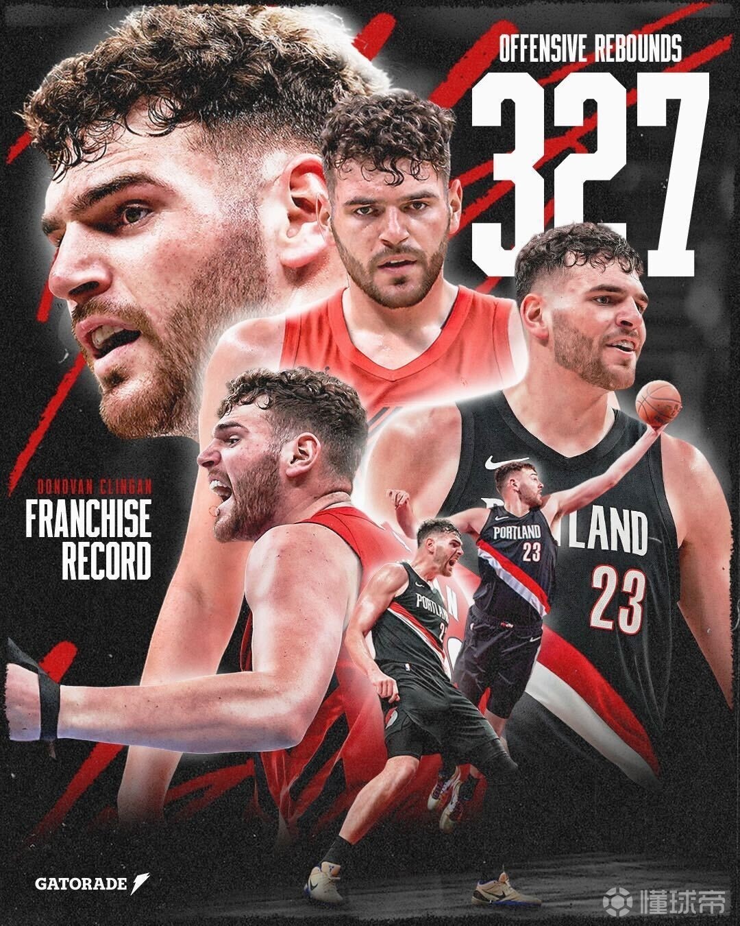 本赛季截至目前,克林根已经抢下327个进攻篮板,刷新了开拓者队史进攻篮板纪录。