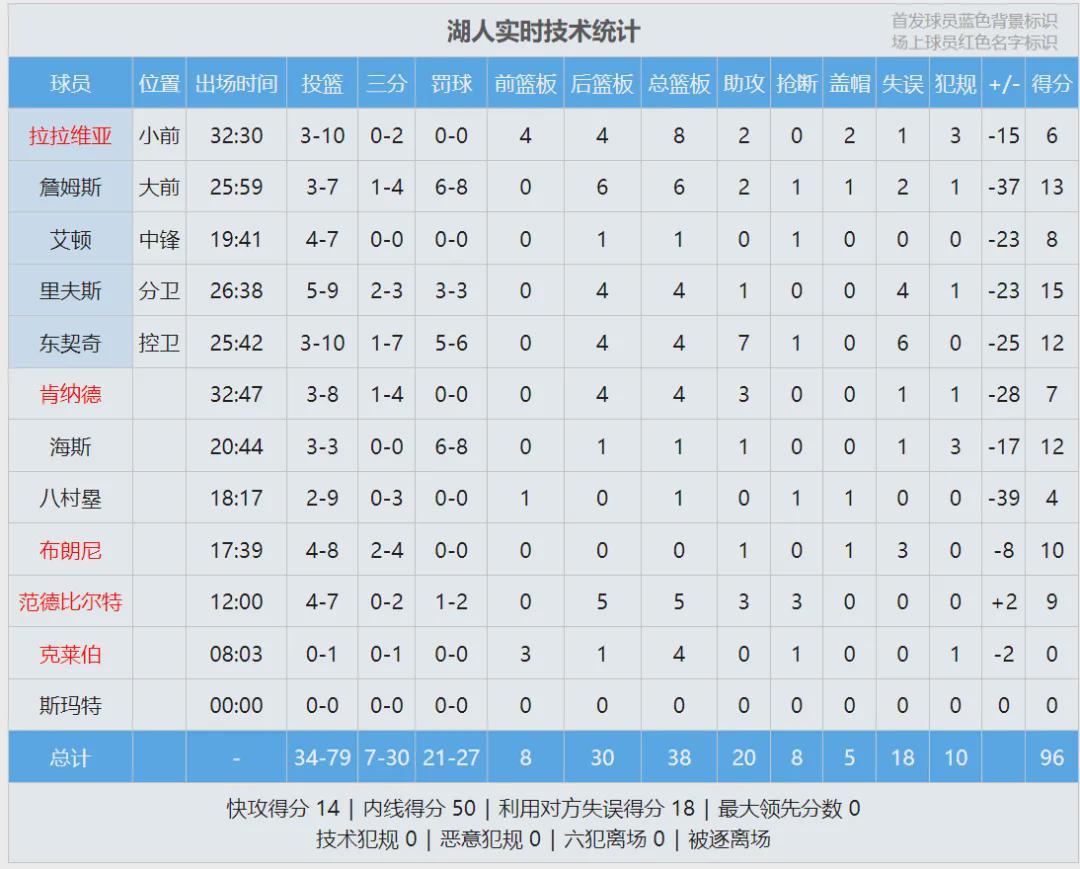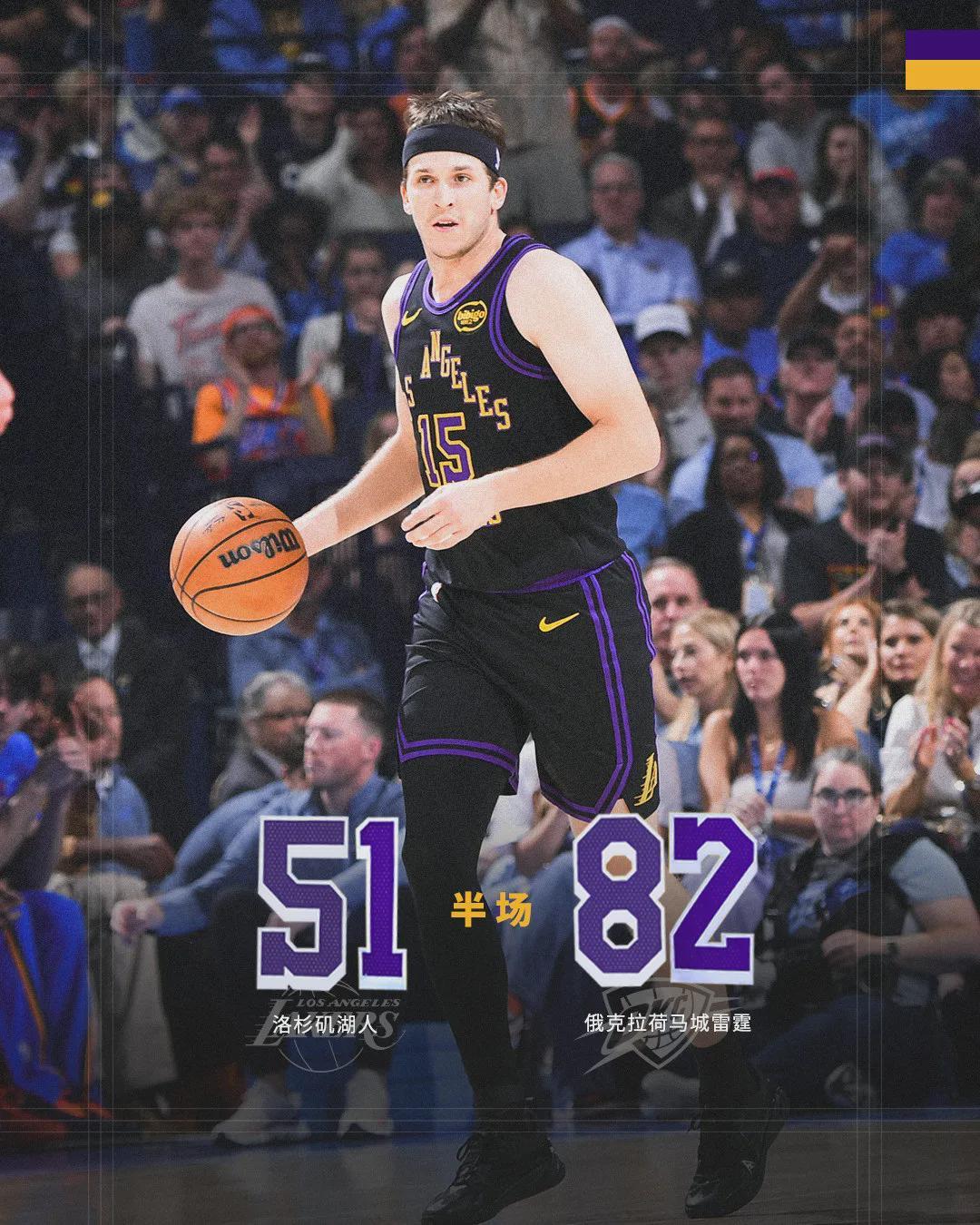 第二节雷霆再轰38分,半场打完,雷霆82-51领先湖人31分。里夫斯7中5拿到14分4失误,东契奇9中2得到10分4板5助4失误,詹姆斯3中1拿到8分3板2助2失误。湖人上半场罚球18中15,三分16中4;雷霆罚球10中9,三分19中9。