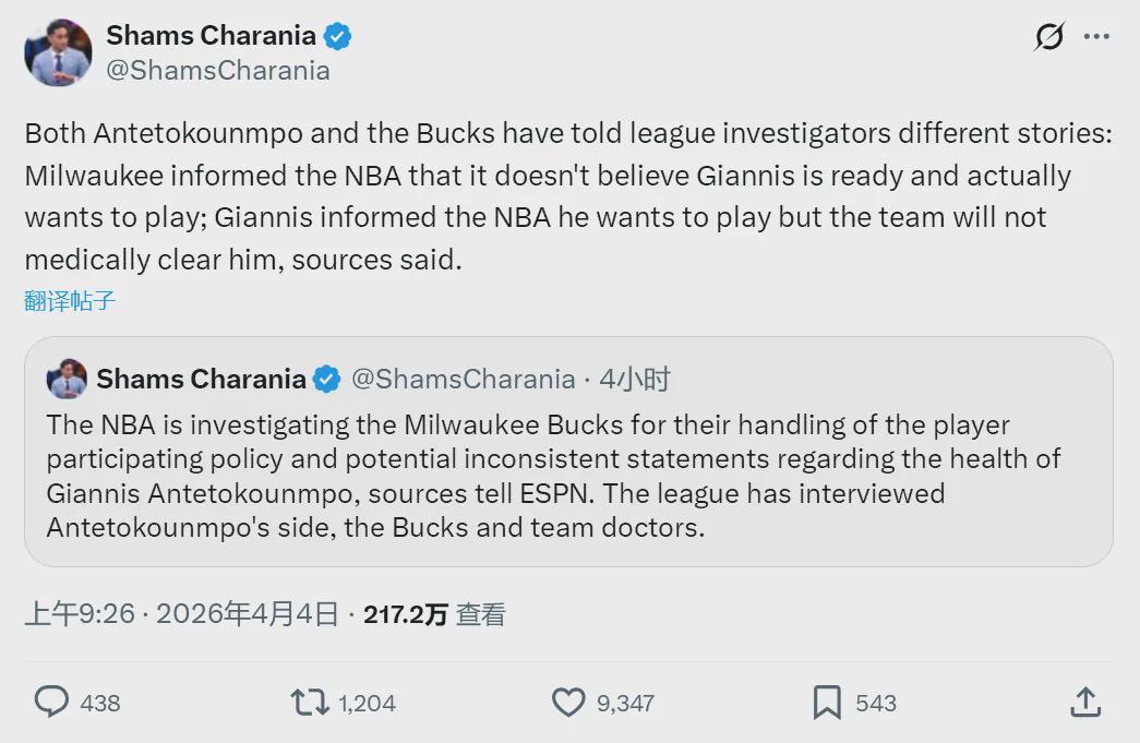 今天咱们要写的并不是凯尔特人双探花,而是雄鹿和字母哥。雄鹿和凯尔特人的比赛还没结束时,ESPN名记Shams爆料,NBA官方正在调查雄鹿是否存在禁止球员参赛以及故意摆烂的行为,联盟调查对象包括字母哥团队,雄鹿管理层以及队医。