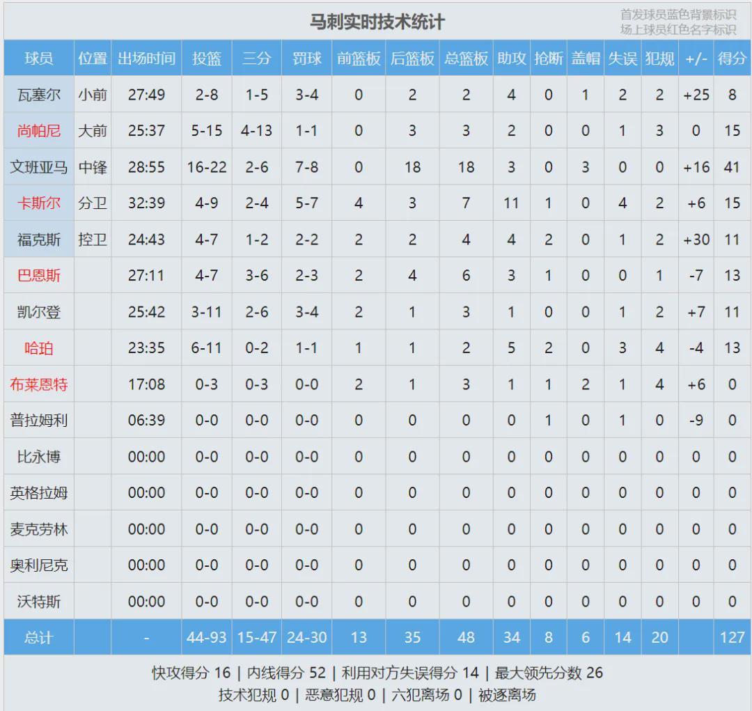 第四节文班上场打了4分钟,马刺重新领先到20+,文班亚马打卡下班。全场结束,马刺127-113战胜勇士。本赛季马刺领先20+的比赛,已经取得了29胜1负。此役文班仅出战28分55秒,22投16中狂轰41分18篮板3助攻3盖帽。