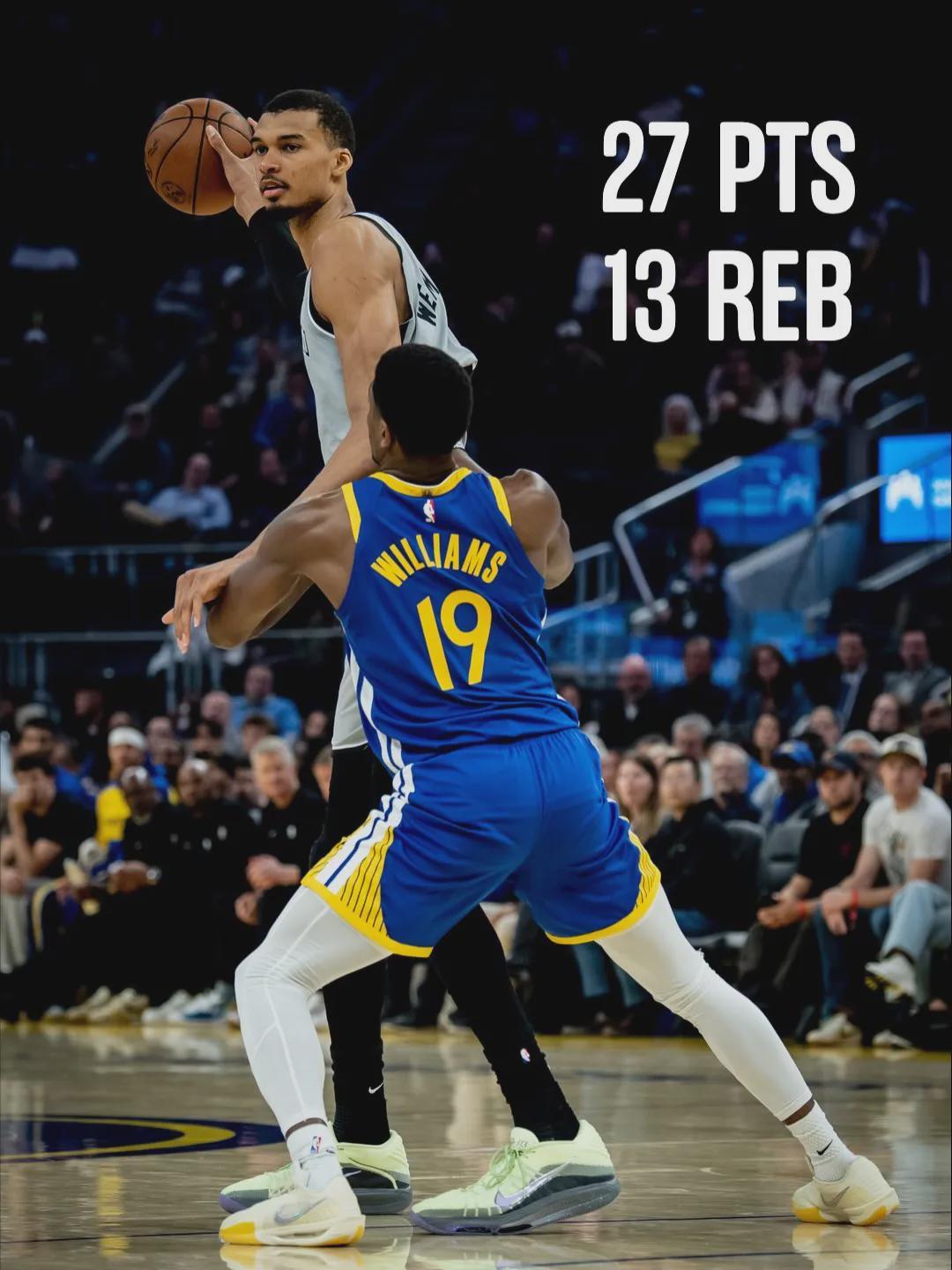 追梦上半场身背4次犯规,第三节打了4分多钟,吃到个人第5犯。不过追梦在进攻端手感不错,第三节投进3记三分。马刺防守有些松懈,勇士第三节34-26单节追回8分。三节打完马刺96-83领先13分,文班前三节已经砍下34+14+3!