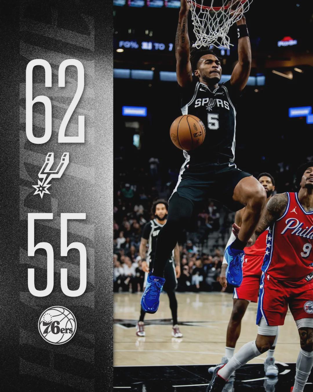 半场战罢,马刺62-55领先76人。恩比德12中7砍下20分6板2帽、乔治9中4拿到13分3板1助。中场休息时,马刺官方宣布:文班因左肋骨挫伤提前退赛。文班亚马出战15分39秒,11投7中砍下17分5篮板1助攻3盖帽,正负值+7。