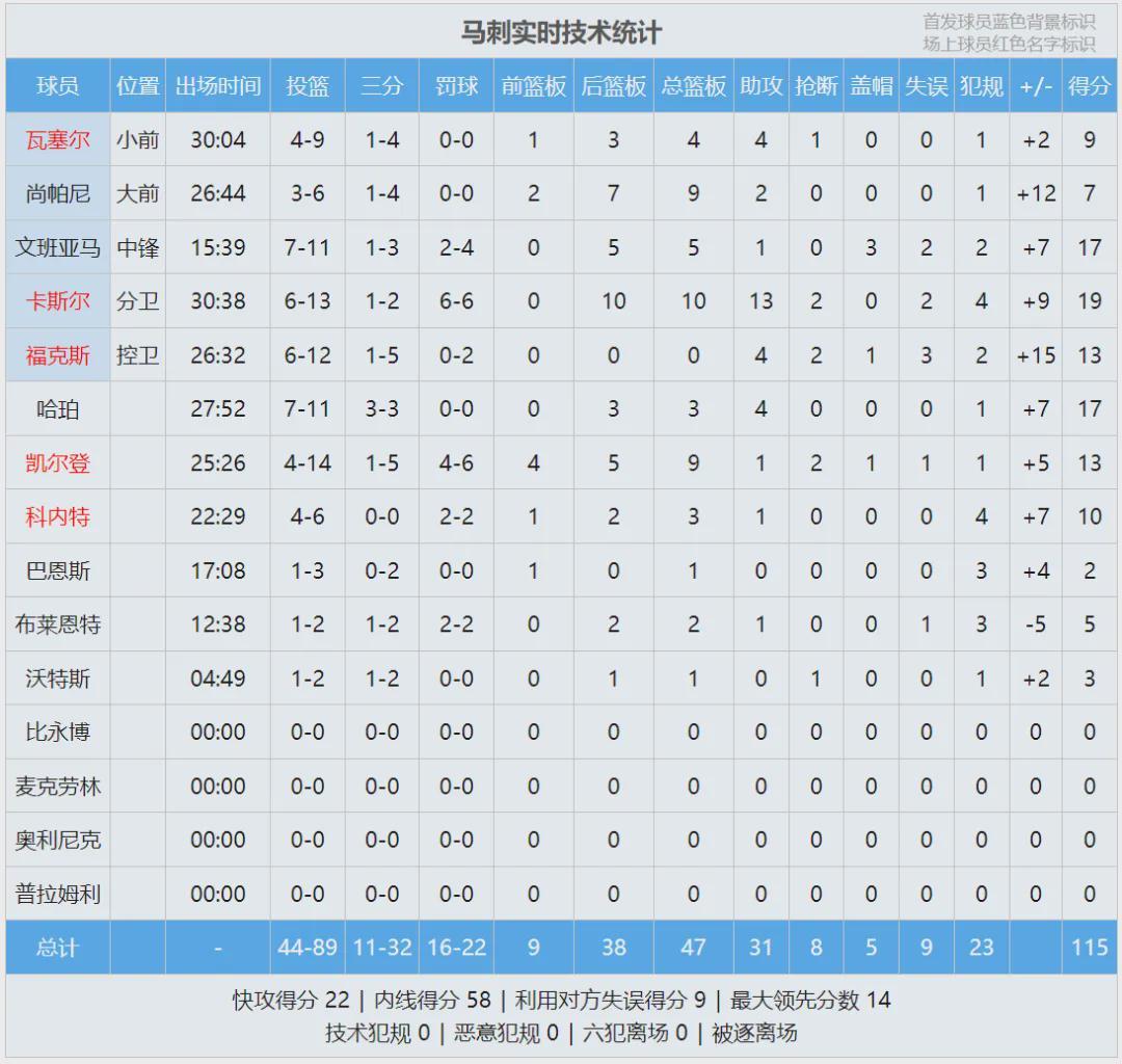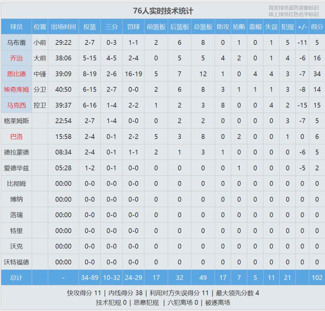 第四节马刺提升防守强度,76人单节仅得到17分。全场战罢,马刺主场115-102战胜76人,马刺时隔9年再次60胜。恩比德空砍34分12板1助4帽、乔治16分5板4助2断,后三节乔治9中1。卡斯尔19分11板13助、哈珀17分3板4助。