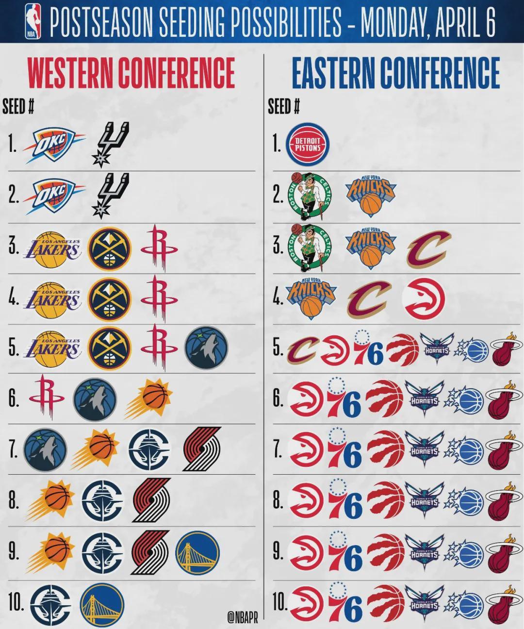 马刺目前排名西部第二,依然还有希望成为第一。76人目前排名东部第六,最好的结果是冲到第五,最差的结果是跌至第十。事实上,除了活塞已经锁定东部第一,其余19支球队的排名都有变数。尤其是东部5-10名,乱成一锅粥了。