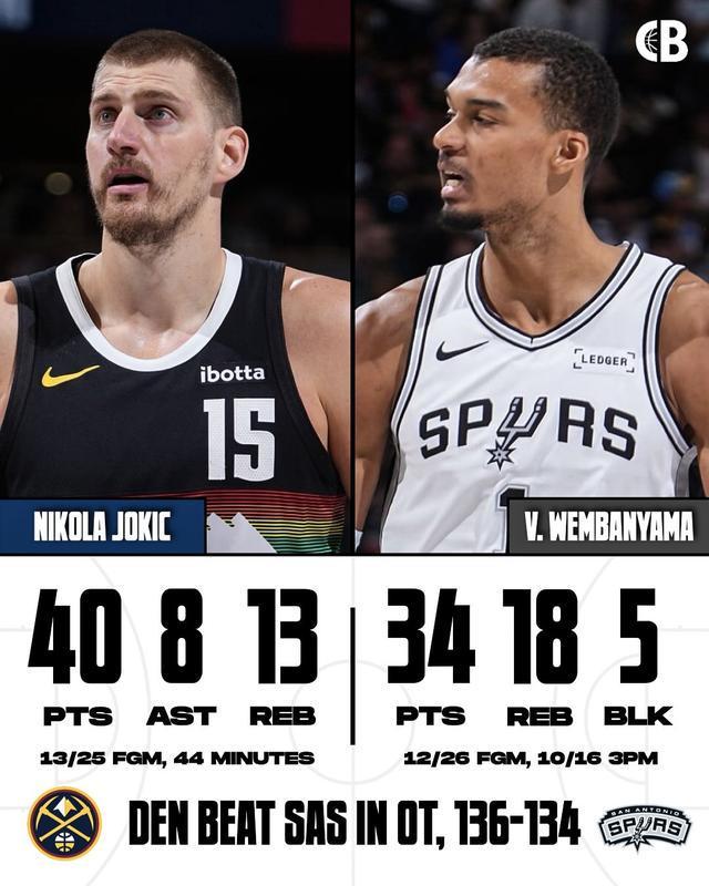 在丹佛这座高原球场上,MVP候选人尼古拉·约基奇和维克托·文班亚马这两大“怪物”展开了一场足以载入史册的对决。约老师轻描淡写地轰下40分、13次助攻、8个篮板和3次盖帽,而且全场竟然0失误!硬是拖着掘金以136比134在加时赛中险胜。对面的马刺中锋文班亚马虽然输了,但站着把数据刷满了:狂砍34分、18个篮板、7次助攻和5记大帽。遗憾的是,这位天才在常规时间最后时刻错失了绝杀,结果几分钟后的加时赛里,老辣的掘金马上就让他交了学费。