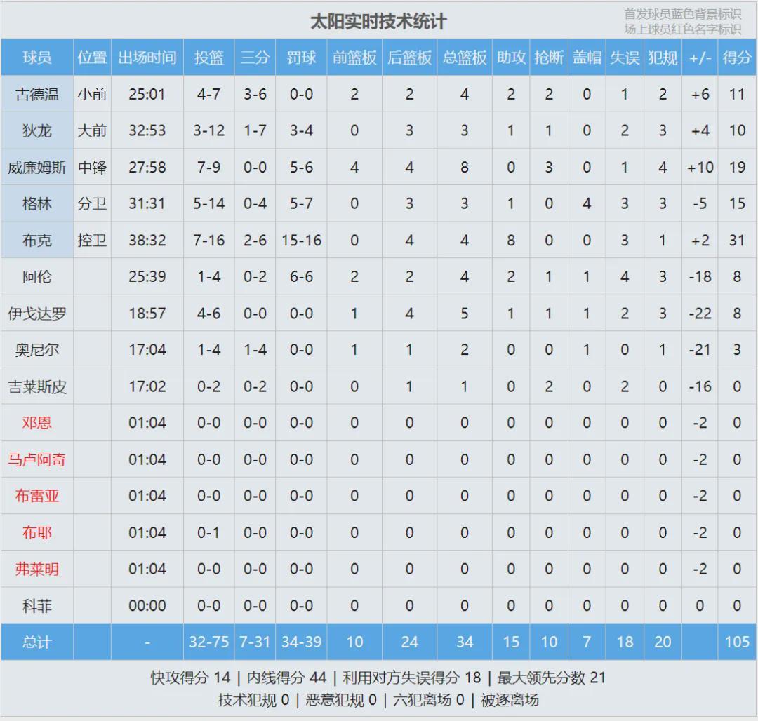 随着太阳输球,西部第六的森林狼正式锁定季后赛。太阳43胜36负暂列西部第7,仅领先快船2个胜场,依然有可能掉到第8。两个火箭旧将发挥糟糕,狄龙-布鲁克斯投篮12中3,三分7中1,罚球4中3,仅得10分3篮板1助攻1抢断。