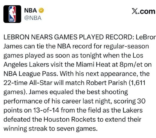 詹姆斯在自己第23個賽季,繼續解鎖新的歷史紀錄。如今詹姆斯成功達成生涯1611場常規賽成就,追平帕裡什並列NBA歷史第一,也是僅有的兩位超過1600場的球員,而下一場詹姆斯就將超越帕裡什獨占歷史第一。