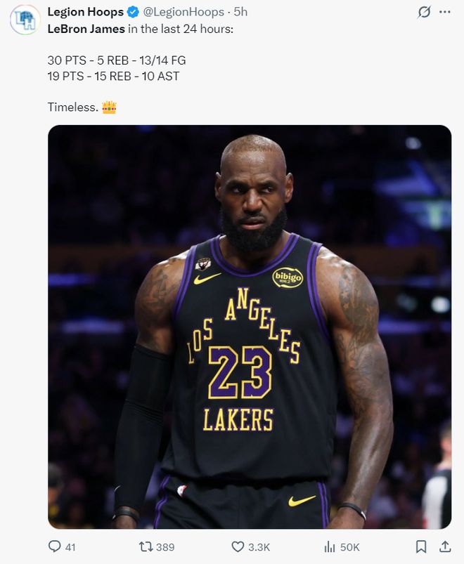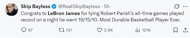 賽後最強詹黑斯利普-貝勒斯都被打服瞭,他寫道:恭喜勒佈朗打破瞭帕裡什的生涯出場次數,他拿到19+15+10。他是有史以來最頑強的籃球運動員之一。