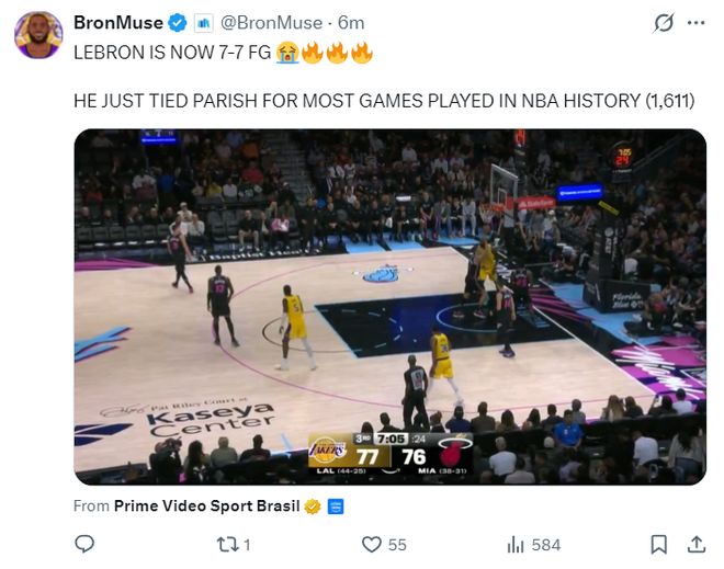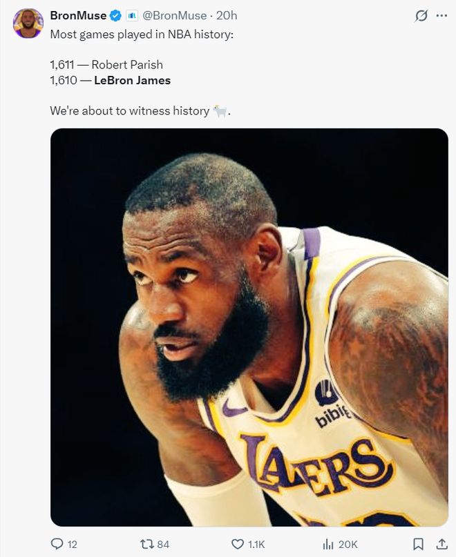 昨夜勒佈朗在面對火箭的比賽中14中13+三分2中2拿到30分一戰刷新多項紀錄,41歲的老將此役決定出戰背靠背後他生涯登場數1611場追平瞭帕特裡什並列歷史第一,這位歷史最長的河繼續創造歷史。