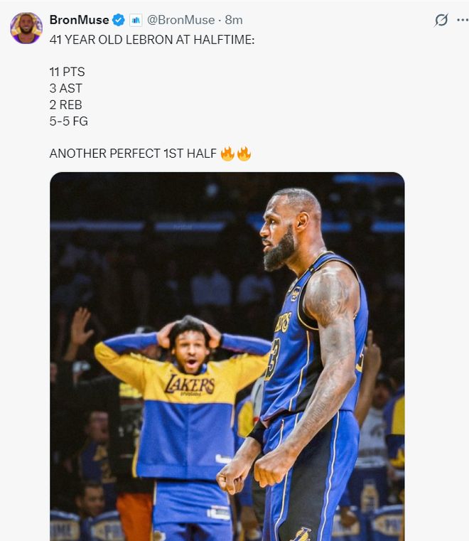 半場詹姆斯5中5,拿到11分3籃板2助攻,命中率100%,41歲的詹姆斯連續兩個上半場保持全中!