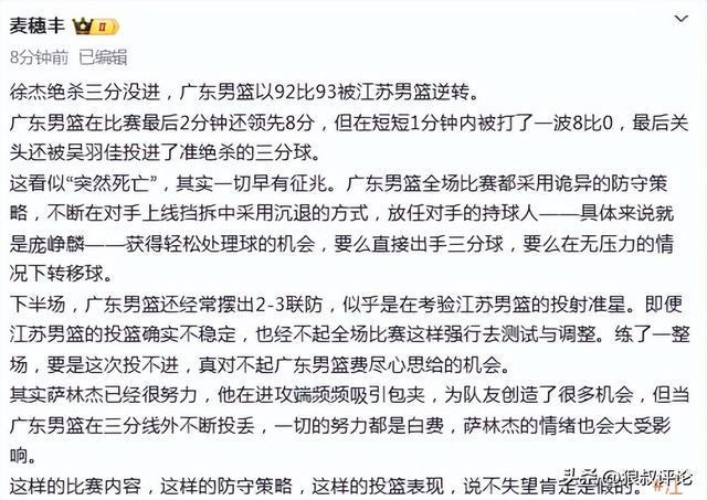 媒體人麥穗豐發文點評:廣東男籃在比賽最後2分鐘還領先8分,但在短短1分鐘內被打瞭一波8比0,最後關頭還被吳羽佳投進瞭準絕殺的三分球。