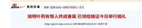 參考資料:《新聞午報》2007年8月7日刊發報道《姚明葉莉有情人終成眷屬 已領結婚證今日舉行婚禮》