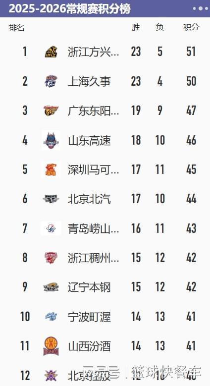 附:CBA積分榜最新排名