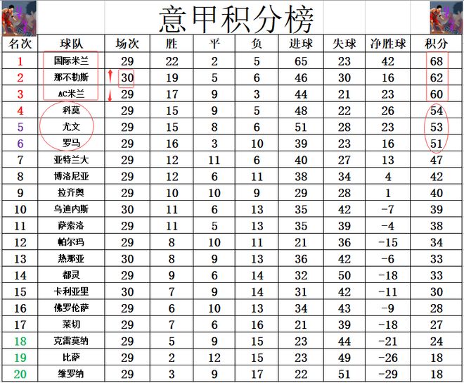 積分榜方面,國米繼續穩穩領跑,那不勒斯連續4輪一球小勝奪4連勝,先賽的他們暫時超過AC米蘭2分升至第2。爭四很激烈,黑馬科莫1分優勢力壓尤文守住第4,羅馬3分之差排在第6。