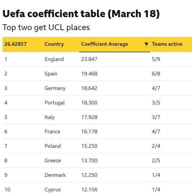 其实一周之前,Opta就曾经做过超算推演,预测英超有99%的概率位列欧战积分前二——哪怕是在欧冠16强屡遭惨案的情况下。而据BBC的粗略估算,英超大概领先西甲、德甲18个胜场,这也是个很难追的数字。由于曼城、切尔西、热刺和纽卡斯尔的被淘汰,总计9队参赛的英超确实很可能接下来涨分困难,但西甲和德甲也未必能够提速,而且这是赛程就决定了的事情:欧冠1/4决赛皇马对拜仁,西甲、德甲必有一伤,而巴萨与马竞的相遇又使得西甲不可能全员进入欧冠半决赛。如此英超“坐山观虎斗”,就算后面不怎么拿分也未必会被彻底反超。