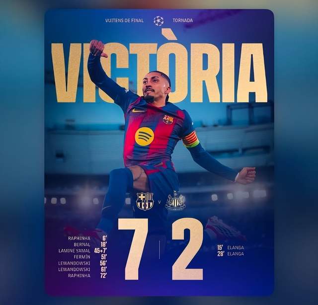 欧冠1/8决赛次回合,巴萨在诺坎普球场7-2大胜纽卡,总比分8-3淘汰喜鹊,杀进欧冠8强。拉菲尼亚独造5球,莱万梅开二度,亚马尔也有进球。巴萨球员、球迷享受胜利的同时,俱乐部也赚到巨额奖金。