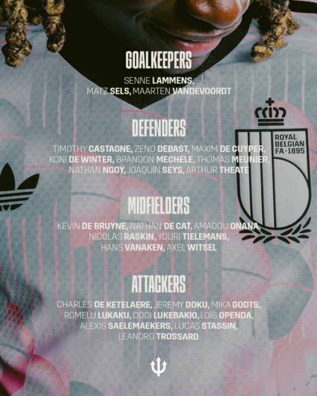 比利时队名单:德布劳内、卢卡库、多库、奥蓬达、特罗萨德在列