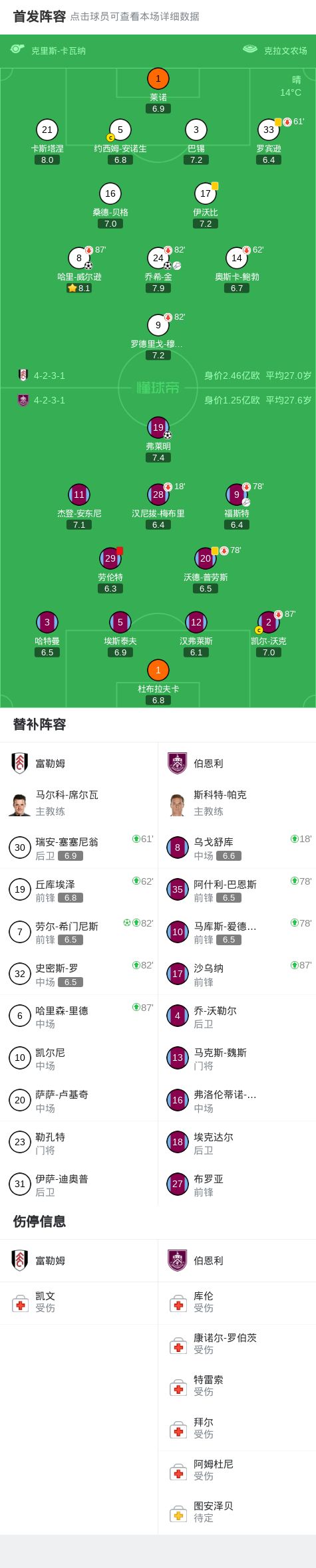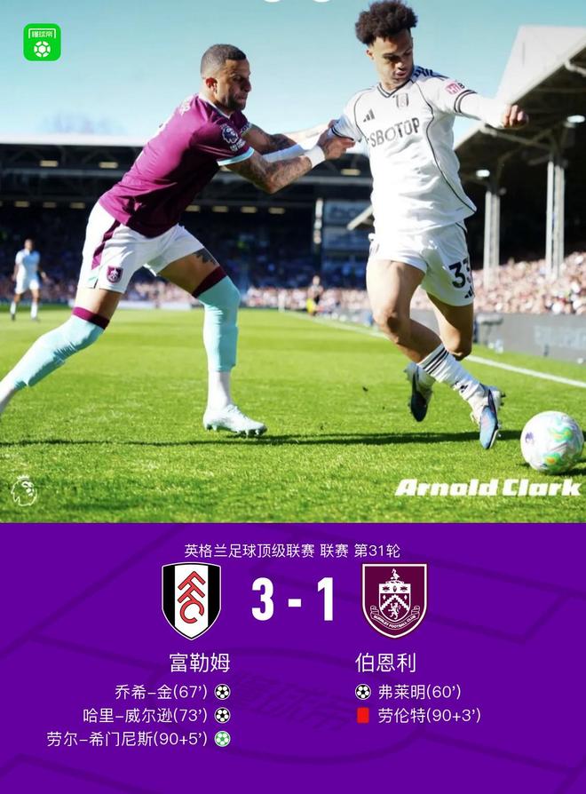北京時間3月21日英格蘭足球超級聯賽第31輪,富勒姆主場對陣伯恩利。下半場弗萊明首開記錄,喬希-金破門扳平比分,哈裡-威爾遜破門反超,勞爾-希門尼斯造點親自主罰命中,勞倫特被紅牌罰下。伯恩利弗萊明破門。最終比分富勒姆 3-1 伯恩利。