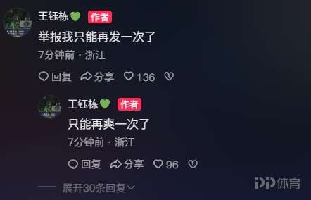 今日,王钰栋将照片中的海牛球迷打码后,再度发出,并配文:继续发继续爽,并在评论区表示:举报我只能再发一次了,只能再爽一次了。