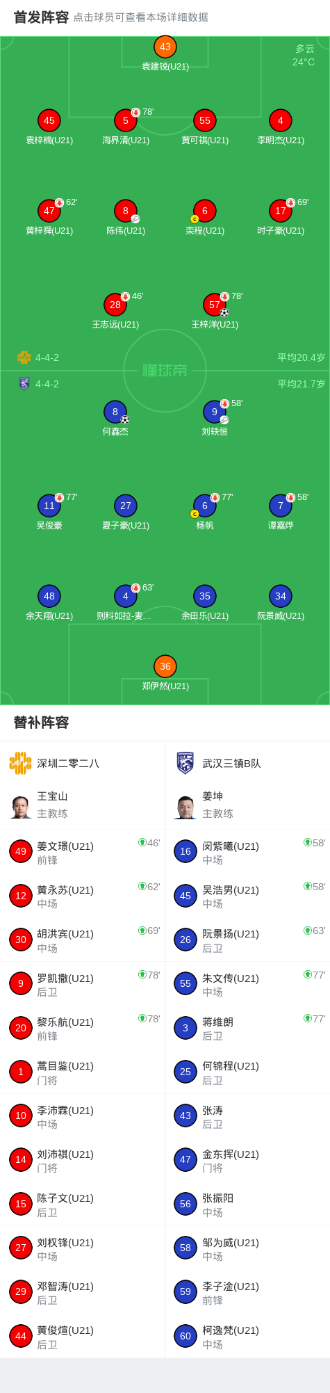 北京时间3月22日中国足球乙级联赛 预赛阶段 第1轮,深圳二零二八主场对阵武汉三镇B队。深圳二零二八王梓洋破门。武汉三镇B队何鑫杰破门。最终比分深圳二零二八 1-1 武汉三镇B队。