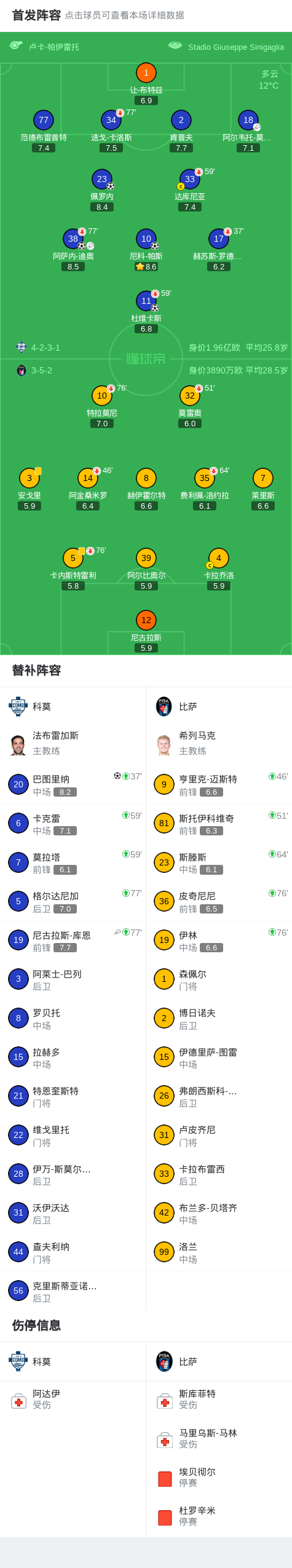 北京时间3月22日意大利足球顶级联赛 联赛 第30轮,科莫主场对阵比萨。科莫阿萨内-迪奥破门,杜维卡斯破门,巴图里纳破门,尼科-帕斯破门,佩罗内破门。最终比分科莫 5-0 比萨。
