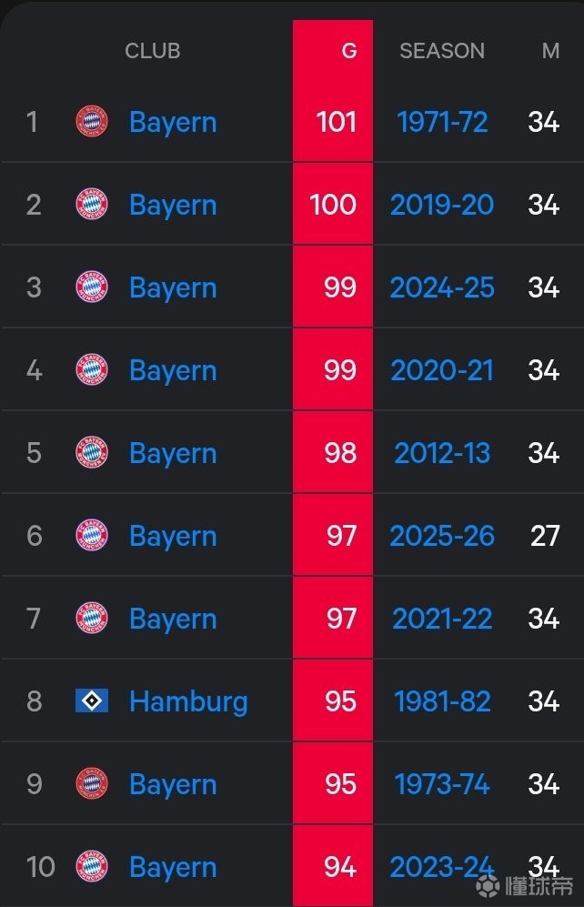6.拜仁慕尼黑 97球 2025-26赛季 27轮比赛(本赛季德甲还剩7轮)