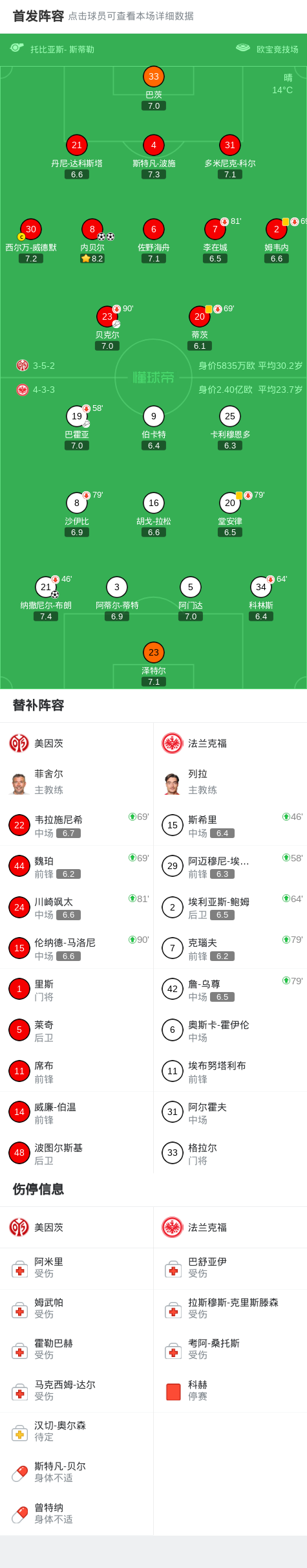 北京时间3月22日德国足球顶级联赛 联赛 第27轮,美因茨主场对阵法兰克福。美因茨内贝尔梅开二度。法兰克福纳撒尼尔-布朗破门。最终比分美因茨 2-1 法兰克福。