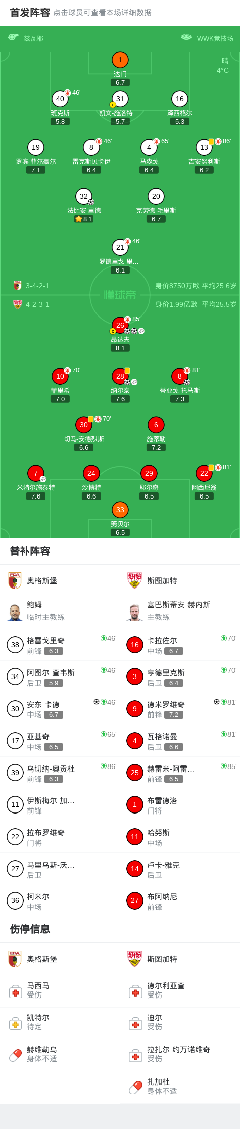 第71分钟,奥格斯堡球员安东-卡德打入一球。