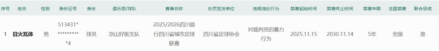 2025年11月15日,川超联赛,凉山队3-3战平乐山队。赛后,凉山队球员日火瓦体飞踹裁判,之后他被四川足协省内禁赛5年,并被行政处罚。如今,处罚决定扩至全国执行。