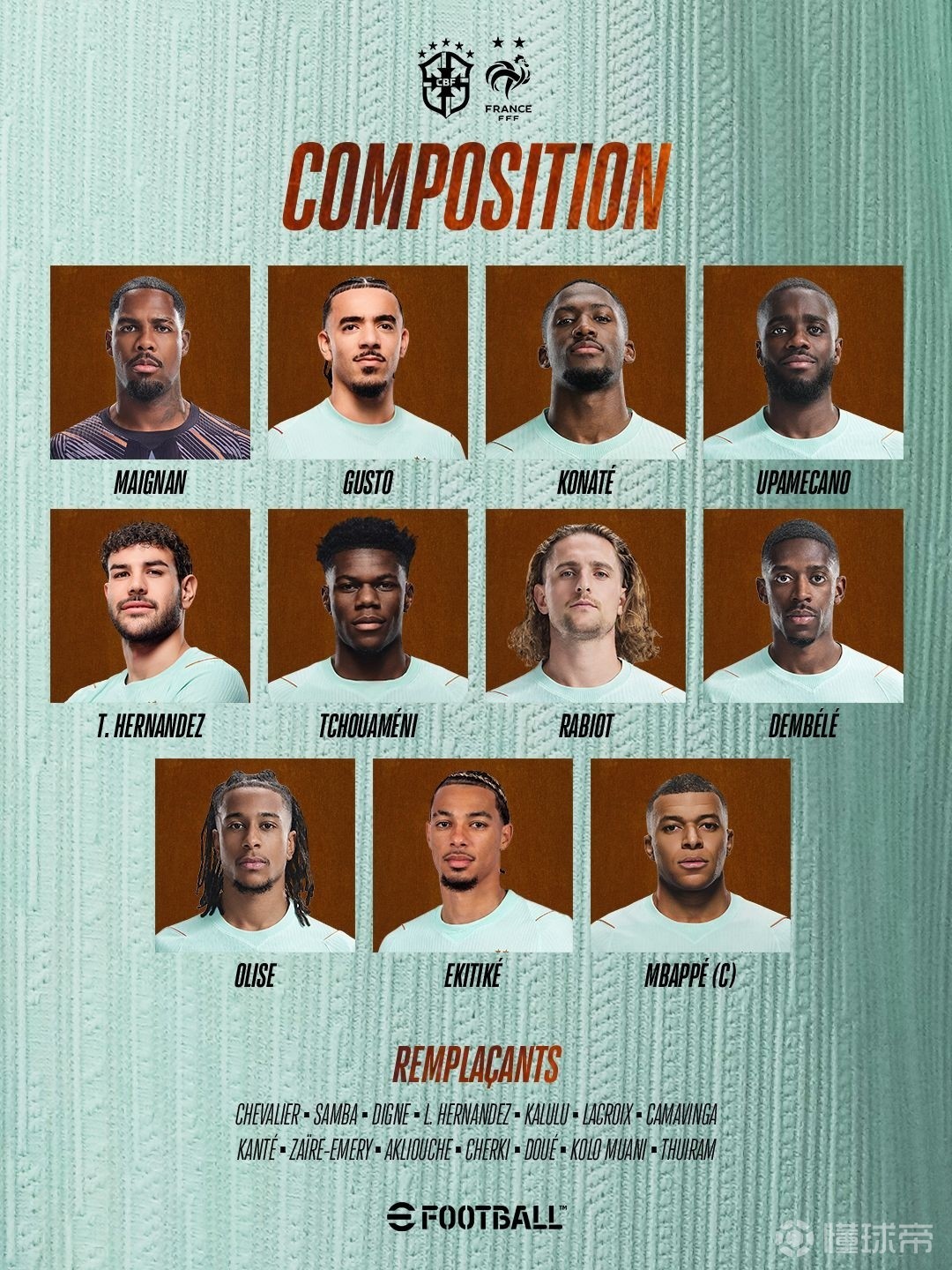 北京时间3月27日凌晨4点,巴西和法国将在美国进行友谊赛的对决。赛前,双方公布首发阵容。