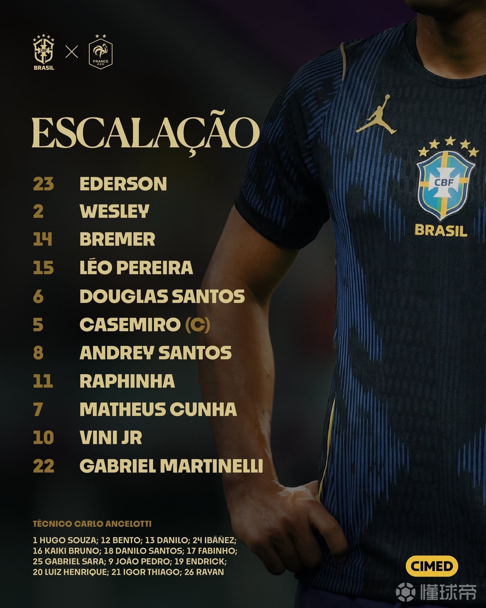替补:1-乌戈-索萨、12-本托、13-达尼洛、24-罗热-伊巴涅斯、16-凯基、18-达尼洛-桑托斯、17-法比尼奥、25-加布里埃尔-萨拉、9-若昂-佩德罗、19-恩德里克、20-路易斯-恩里克、21-伊戈尔-蒂亚戈、26-拉扬