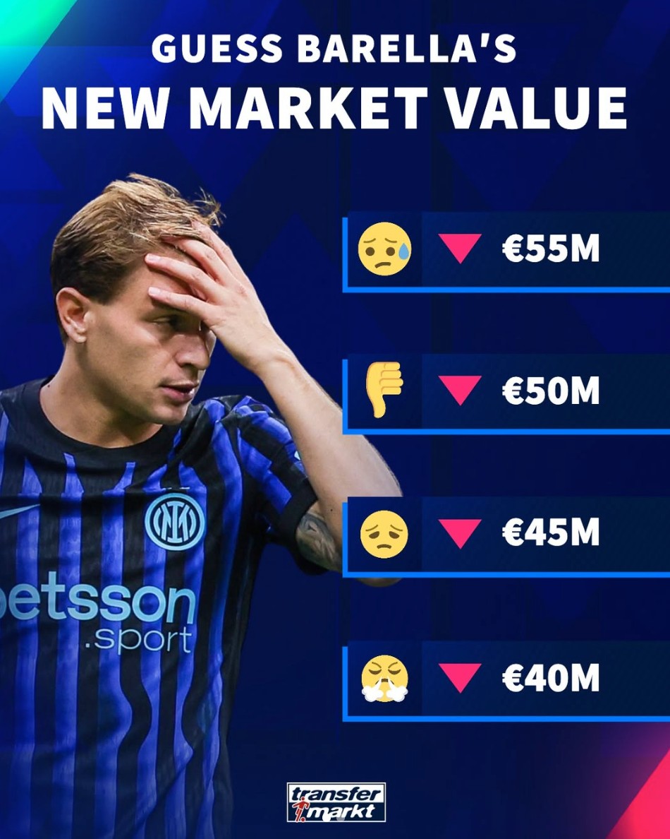 北京时间3月22日,德转预热了国际米兰中场巴雷拉的身价更新,他们给出了四个选项,全部为下跌,最低跌至4000万欧元。