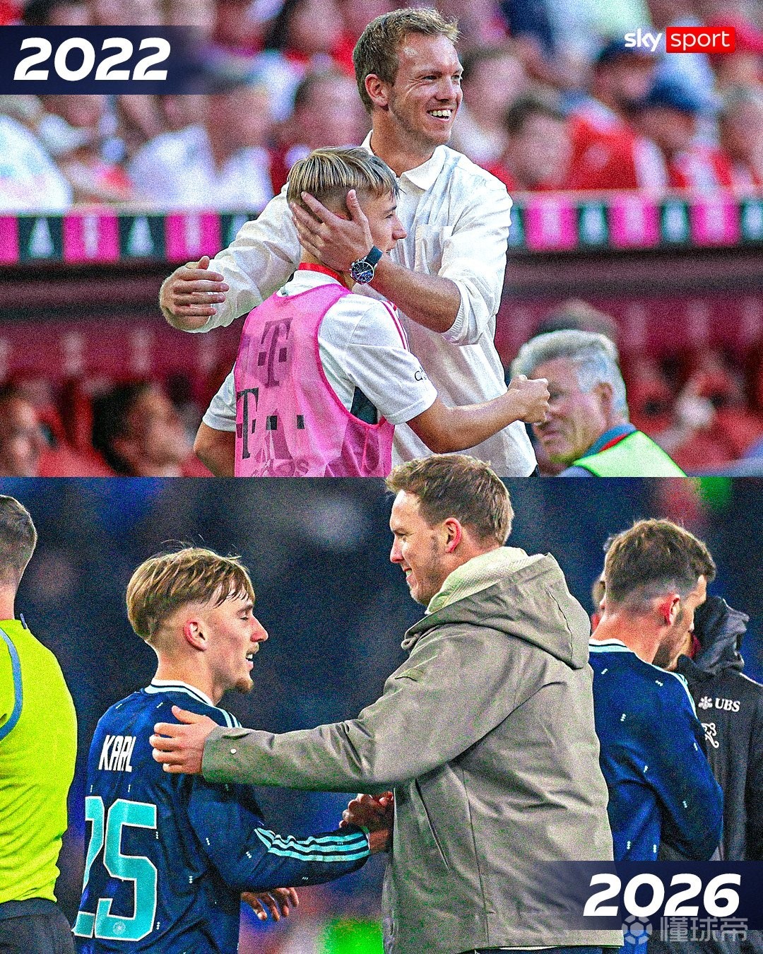 北京时间3月28日,德国队在友谊赛中4-3战胜瑞士队。比赛下半场,德国队主帅纳格尔斯曼派上小将伦纳特-卡尔,赛后两人在赛场握手致意,这一幕距离上一次同框已过去四年。当时的卡尔,还只是拜仁的一名小球童。