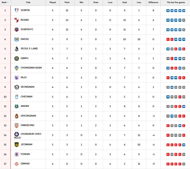 积分榜上,水原三星、釜山、水原FC分列前三位,大邱虽然位居第四,但已经和前面拉开了“一场”的分差。而新军金海FC2008本轮轮空后,依旧成为K2联赛唯一一支未取得分数的球队。