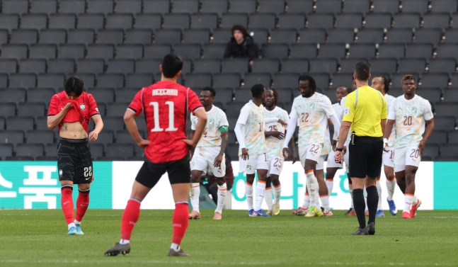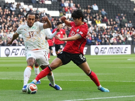 本场比赛,洪明甫如他所愿排出了一个3-4-3阵型:门将赵贤祐,三中卫由金太炫、金玟哉和曹侑珉组成,左边翼卫薛英佑,中场朴镇燮搭档金镇圭,右边翼卫金纹焕,左边前卫裴俊浩,右边前卫黄喜灿,单箭头吴贤揆。开场阶段,韩国队压迫凶猛,薛英佑与金纹焕一度压至对手大禁区前沿。然而双方试探过后,科特迪瓦开始利用其身体与速度优势主打边路。他们在实战中发现,虽然薛英佑镇守的左路活动范围大、身后空档也不小,但他的身体对抗与回追速度毫不逊色;而右路的金纹焕与右中卫曹侑珉之间则暴露出更大空档,金纹焕在速度和身体对抗上均处于劣势。于是,科特迪瓦集中火力猛攻韩国右路,并通过高位逼抢迫使曹侑珉两次出现致命失误,导致丢球。